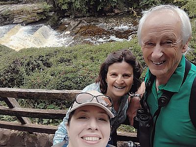 Colourful heathers from deep pinks to strong whites, birds hovering over water and sitting on flat rocky outcrop close to a dramatic waterfall are the highlights of our fundraising walk in Wensleydale.